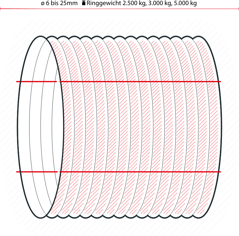 Betonstahl in Ringen wird in den Durchmessern 6 bis 25 Millimeter durch Kaltrecken des warmgewalzten, gerippten Ausgangsmaterials und anschließendes Aufspulen hergestellt. BSW betreibt seit 1985 Reckanlagen und verfügt aus diesem Grund über einen reichen Erfahrungsschatz bei der Herstellung. Dies wissen die Kunden aus ganz Europa zu schätzen.