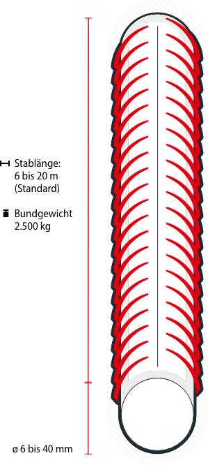Der BSW-Betonstahl zeichnet sich durch hohe Qualität und beste Berarbeitungseigenschaften aus. Betonstabstahl der Durchmesser von 10 bis 40 Millimeter wird mit Hilfe des bewährten TEMPCORE-Verfahrens hergestellt: Durch Wärmebehandlung aus der Walzhitze erhält der Stahl seine hervorragenden Eigenschaften. Betonstabstahl der Durchmesser 6 und 8 mm wird durch Recken und anschließendem Richten hergestellt.